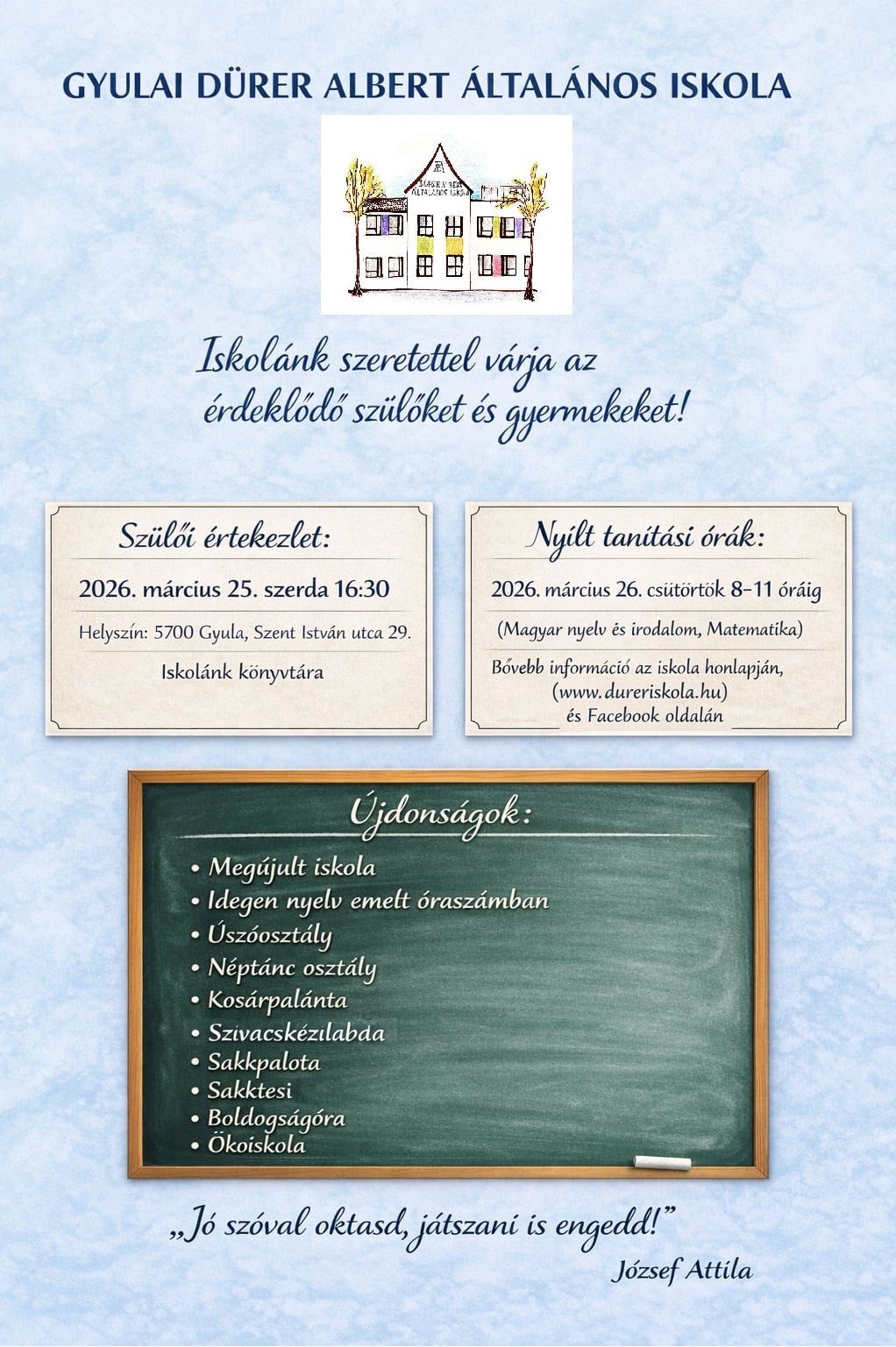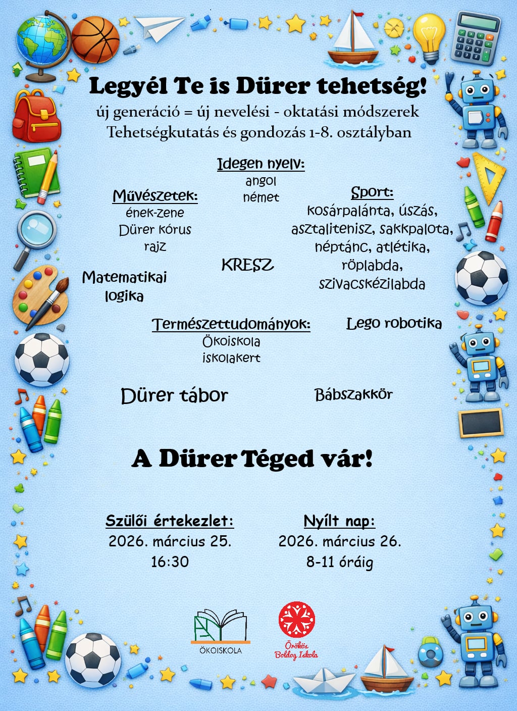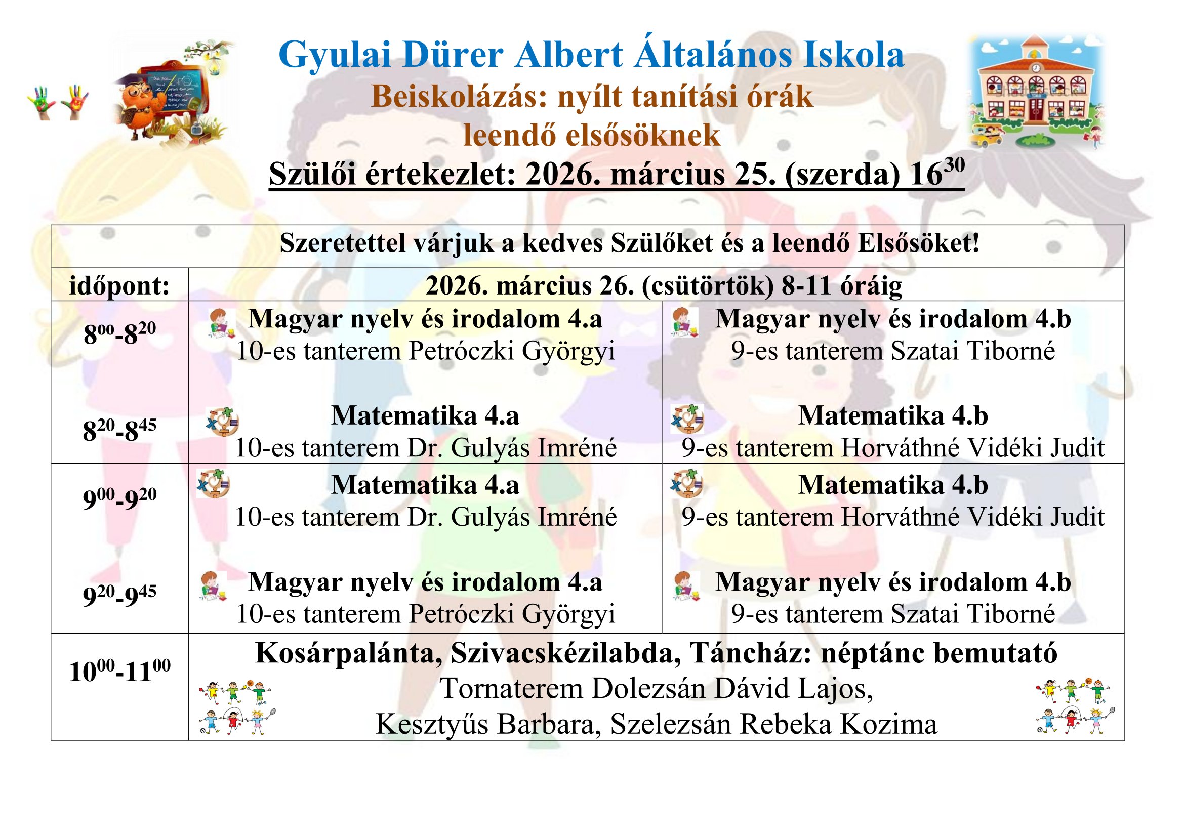 Nyílt tanítási órák, szülői értekezlet leendő elsősöknek 2026 - 2027. tanévre